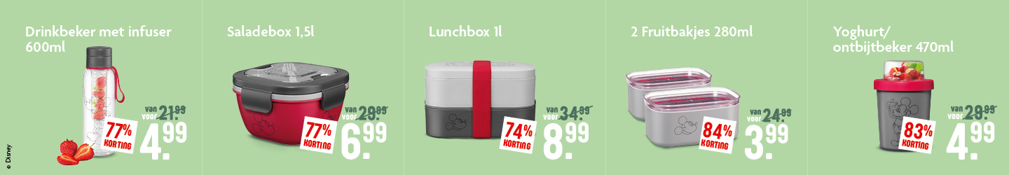 De Disney To Go producten zijn hoogwaardig én ook nog eens hartstikke mooi om te zien! Praktisch, duurzaam en geschikt voor warme en koude gerechten. Zo kun je de lekkerste tussendoortjes, fruithapjes, snacks en salades op een leuke én handige manier meenemen. Naar school, naar werk of gewoon voor onderweg. En dat is mooi meegenomen. De lunchbox, fruitbakjes, yoghurt- en ontbijtbeker en saladebox kunnen zowel in de magnetron als in de vaatwasser. Mooi toch?
