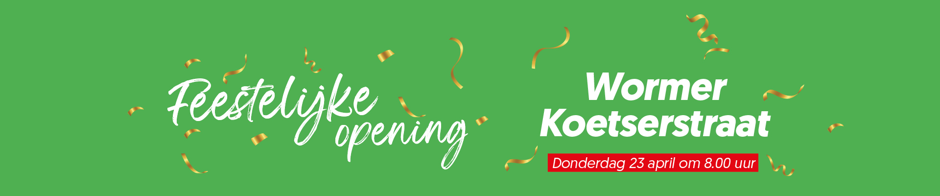 | Tekst | Beleef het feest! Vanaf donderdag 23 april ben je welkom in onze vernieuwde winkel in Wormer. Schrijf je ook in voor onze nieuwsbrief en blijf op de hoogte. |