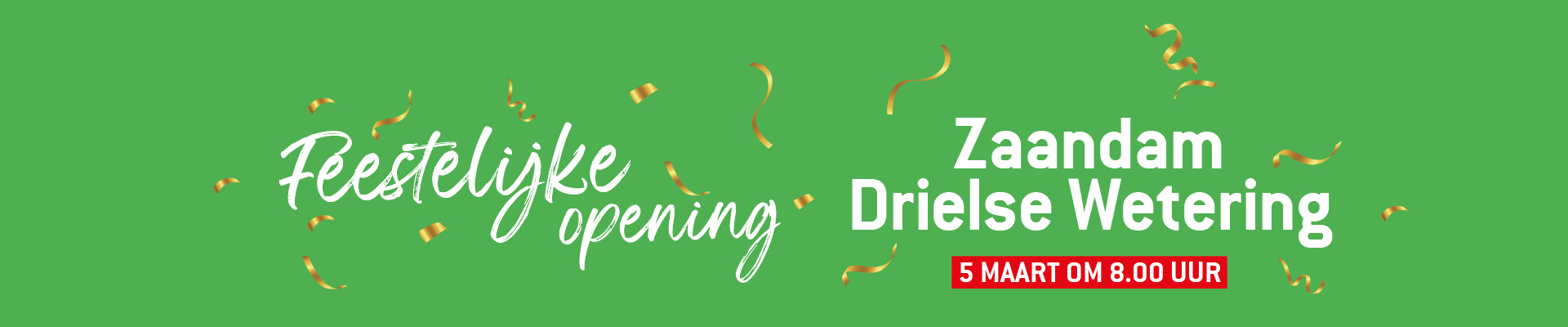 | Tekst | Beleef het feest! Vanaf donderdag 5 maart ben je welkom in onze vernieuwde winkel in Zaandam. Schrijf je ook in voor onze nieuwsbrief en blijf op de hoogte. |